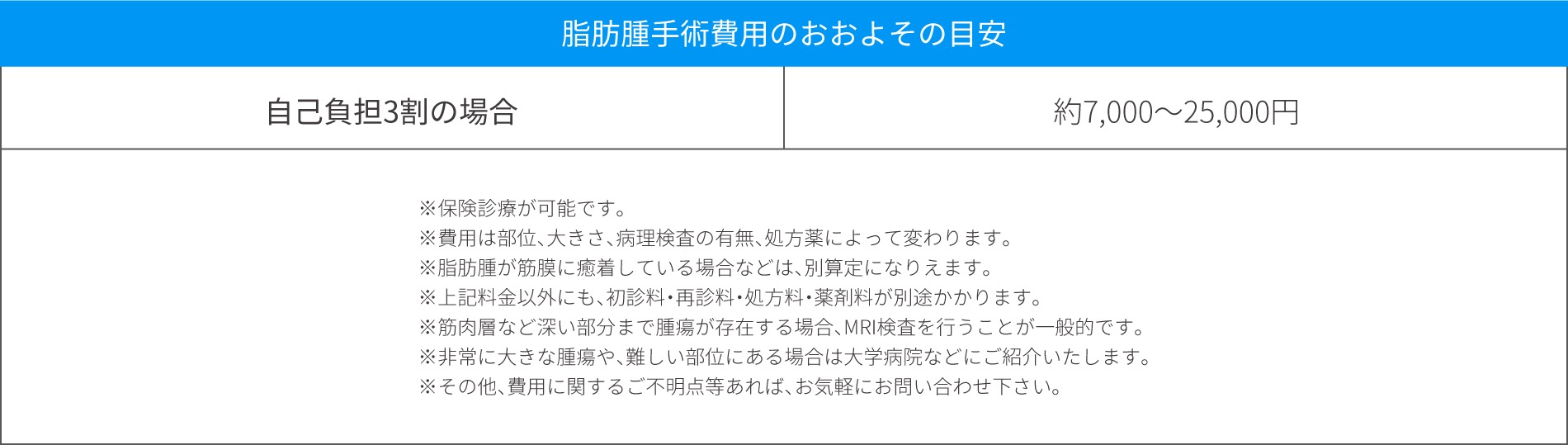 女性・肥満者に多いと言われています。また、初期症状はなく、徐々に大きくなった段階でコブとして気づきます。数年かけて大きくなるのが一般的で、数ヶ月単位で急に大きくなった場合は悪性腫瘍も考えなければなりません。